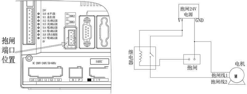 注塑驅控一體機控制系統包括QC-S1E、QC-S2E、QC-S3G三款型號,機械手電機抱閘接線示意圖,QC-S1E/QC-S2E電機抱閘接線圖一樣,如下: