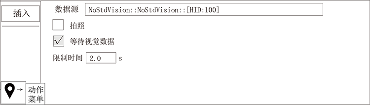 1、選擇數據源,勾選拍照,根據情況選擇某個輸出點,設置其動作時間,輸出次數及間隔時間,表示某個輸出點有輸出后拍照多少秒,間隔多久后再拍照,共拍照幾次,插入到主程序中后再進入視覺指令頁面勾選等待視覺數據設置限制時間,表示拍照不成功沒有數據反饋后等待多久報警。例如要讓輸出Y15時進行拍照2s,每間隔3s后輸出一次Y15進行拍照,三次拍照后若等待2s沒有拍照成功的數據反饋即報警,則參數設置如下所示: