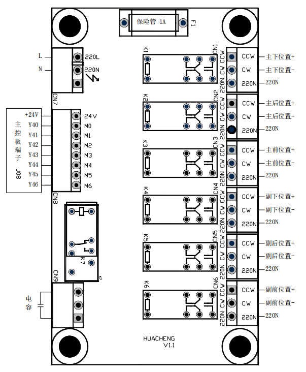 華成標準系列注塑機械手控制系統,HC-S1,單軸注塑機械手控制系統。主控制板接線圖如下:
