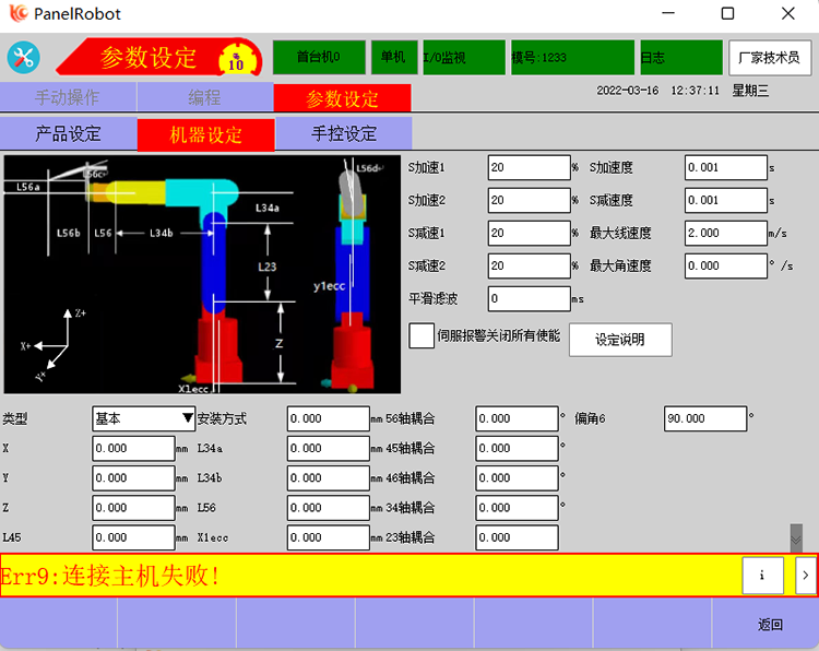 六關節機器人系統應用采用華成系列六軸機器人控制系統,首次通電后需要注意的參數設置問題,分為伺服電機的參數和結構的參數設置。