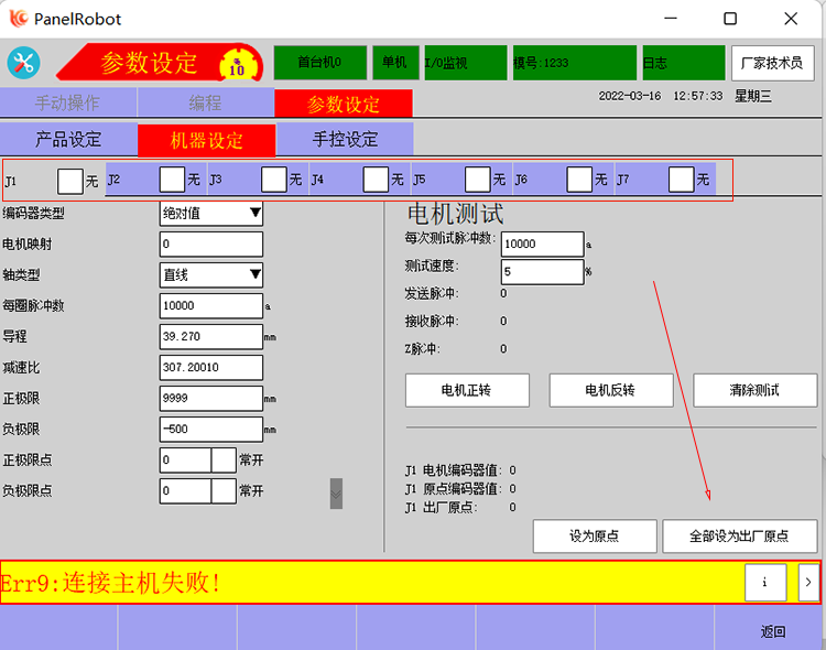 首先,工業(yè)機器人需要校準機械零位,先手動將機器人走到零位,對準刻度后,點擊電機參數(shù)界面的全部設(shè)為原點。