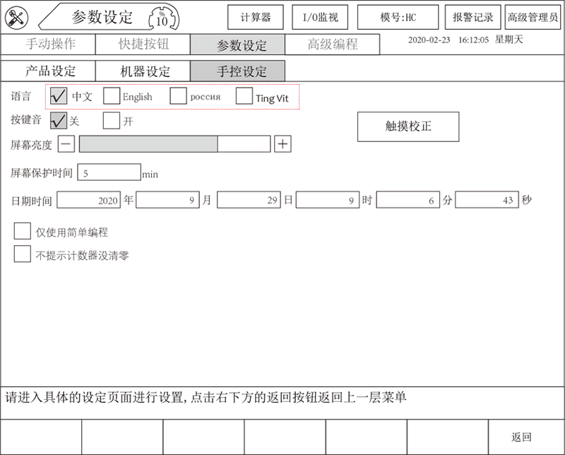 手控器切換在停止狀態(tài)下,進入【手控設定】界面,進行相應的語言版本選擇,如下: