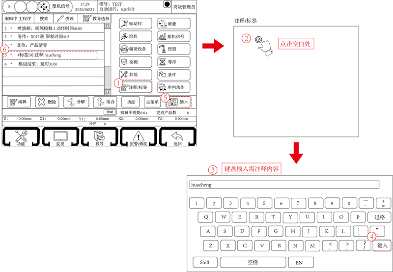 點擊“注釋/標(biāo)簽”按鈕可進(jìn)入注釋/標(biāo)簽的教導(dǎo)頁面,插入了注釋后,可以對上一步程序或者下一步程序進(jìn)行說明;同時在執(zhí)行子程序跳轉(zhuǎn)時必須先要插入“注釋/標(biāo)簽”才可將條件插入進(jìn)主程序中。(如果使用條件必須插入“注釋/標(biāo)簽”)
